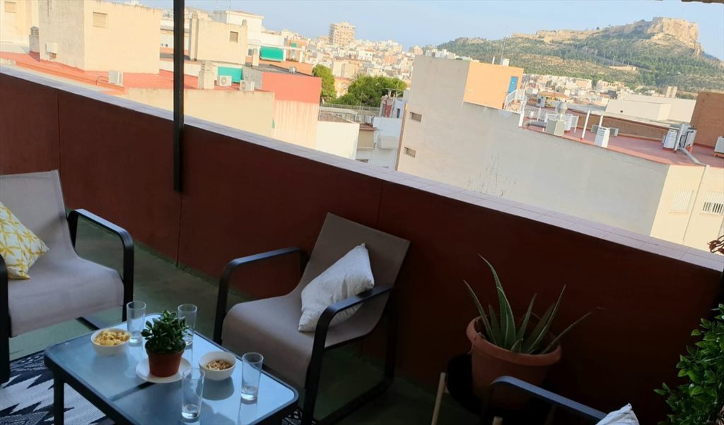 Disfrute de una magnífica terraza de 25 m² con vistas impresionantes al castillo de Santa Bárbara, ideal para desayunos al sol o veladas al aire libre.