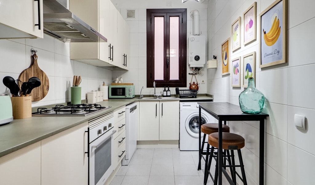 4. Kitchen 100% equipped with all new appliances. All the necessary kitchenware brand new: complete crockery, cutlery, utensils, cookware, etc.. Separate laundry area with washer-dryer. In the heart of Barcelona, “El Gótico” neighbourhood, 50 meters from “Plaza Real.”