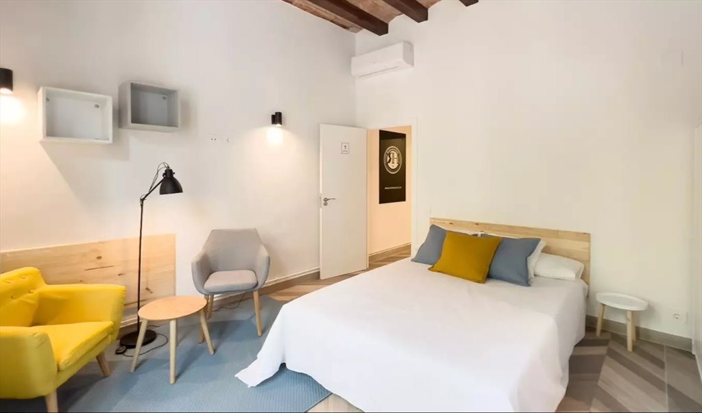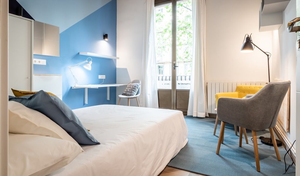 Exterior double room with balcony in a refurbished flat in the Eixample! The 165 m2 flat is located in Plaza Catalunya, in the heart of the city centre, a commercial, tourist and leisure hub. As it is right in the centre of the city, it is very well connected by several metro and bus lines that take you to all corners of the city. The flat is right next to Las Ramblas, Plaza Catalunya, Paseo de Gracia. After Ciutat Vella, l'Eixample can be considered as the other centre of Barcelona. It is a tourist, commercial and leisure centre for locals and foreigners. It is a middle and upper-middle class neighbourhood. As it is a central area, it is perfectly communicated by all means of transport. Very well connected by the metro stations of Plaça Catalunya (L1, L3, L6, L7), RENFE and FGC as well as by the numerous bus stops in Plaça Catalunya. The room is exterior with gallery and balcony, and has a double bed, desk, shelves and wardrobe. The flat also has a living room, two bathrooms, washing machine and a kitchen with: fridge, freezer, oven, microwave and everything you need to move in. It has a huge terrace with several sun loungers and tables in a quiet and chill out atmosphere. Cleaning of the common areas once a week, bed linen, utilities and high speed wifi are included in the price. This room is designed for university students or young professionals to use as a home for study or work purposes.