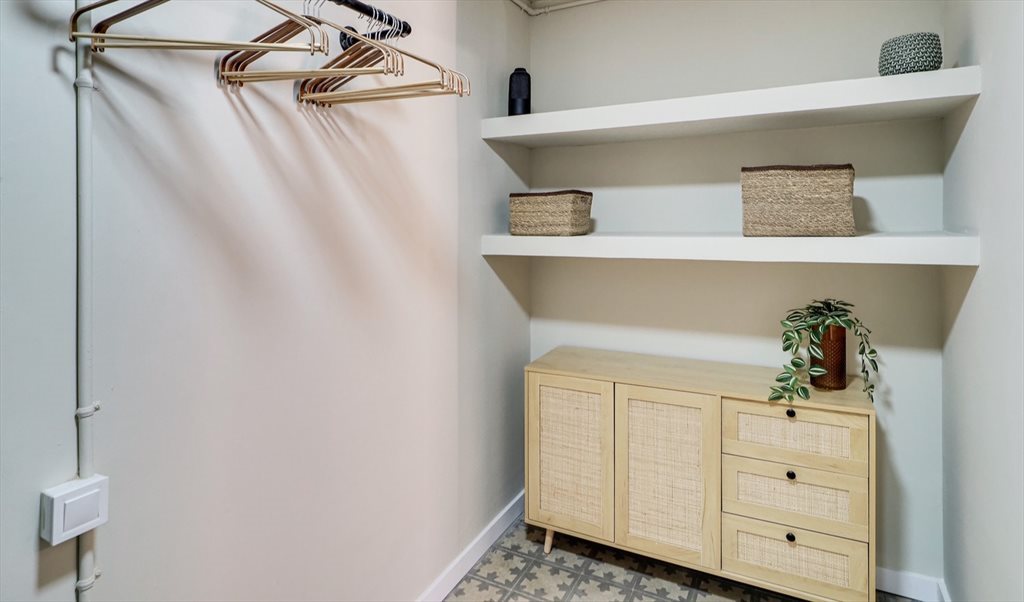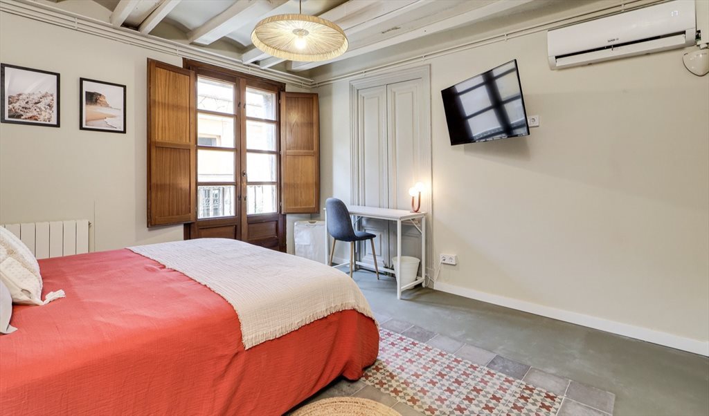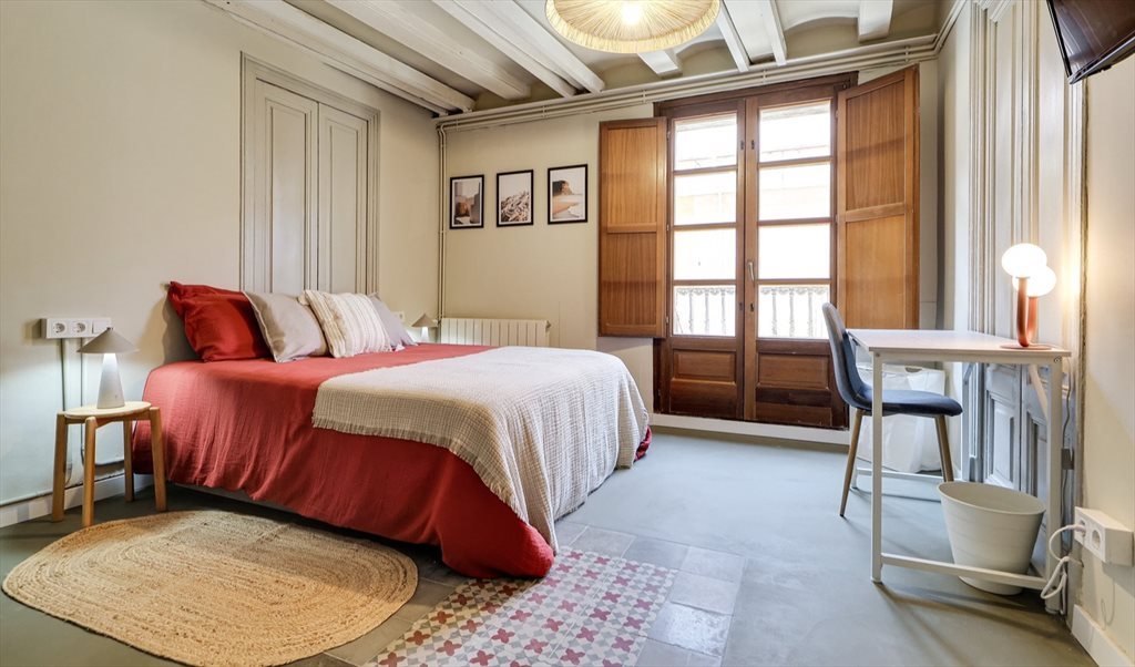 2. Complete double room: bed 150x190 with underneath storage, Smart TV, double closet, desk. Includes pillows, cushions, comforter, sheets, hangers, clothes basket, wastebasket, and towels (all brand new). The room has a ceiling fan with different powers and a separate lock with external key and latch on the inside.