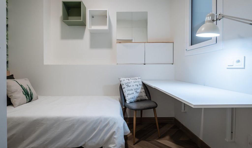 ¡Habitación Interior con cama individual en Eixample! Esta en un piso de diseño muy bien comunicado con el resto de la ciudad por metro y buses. La habitación tiene escritorio, armario, silla de trabajo, dos zapateros y cerradura en la puerta. El piso cuenta con una sala común, comedor, lavadora y una cocina completa. Incluidos en el precio agua, luz, gas, Wifi de alta velocidad y servicio de limpieza en las zonas comunes una vez a la semana, ¡la habitación te encantará!