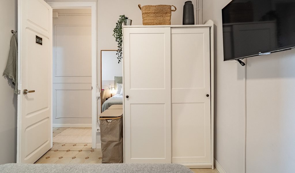 2. Complete room: bed with folding sofa, Smart TV, closet, desk. Includes pillows, cushions, comforter, sheets, hangers, wastebasket, and towels (all brand new). The room has a separate lock with external key and latch on the inside. Private bathroom.