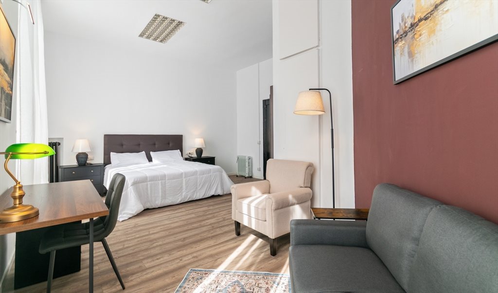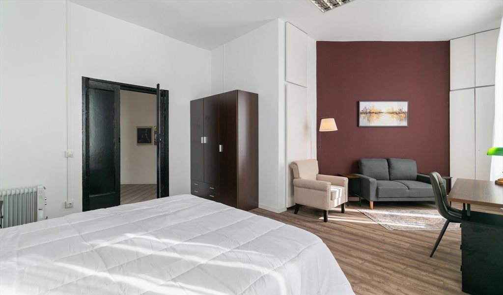 Dispone de cama doble, baño compartido (2 personas) y una cuidada decoración que incluye techos altos con molduras originales, ventanales y balcón que aportan una excelente entrada de luz natural.