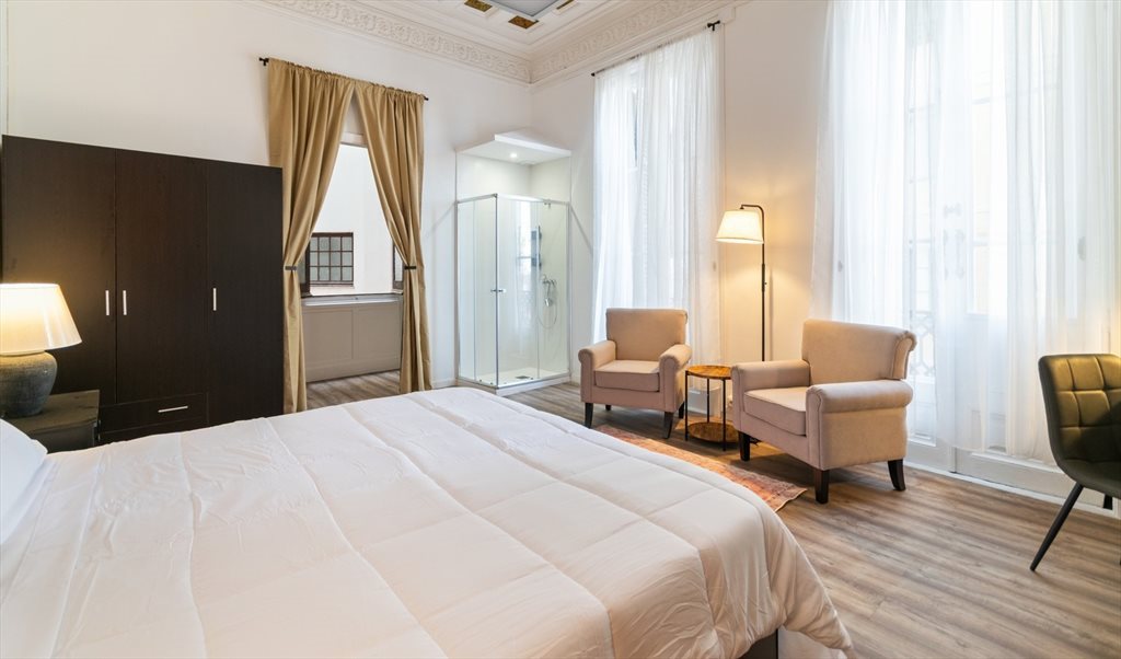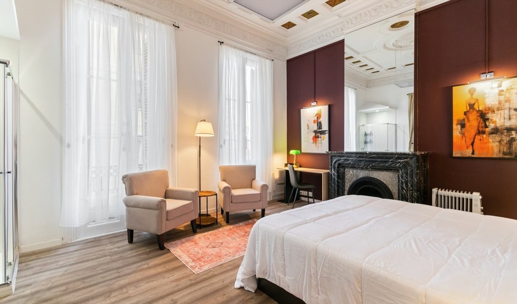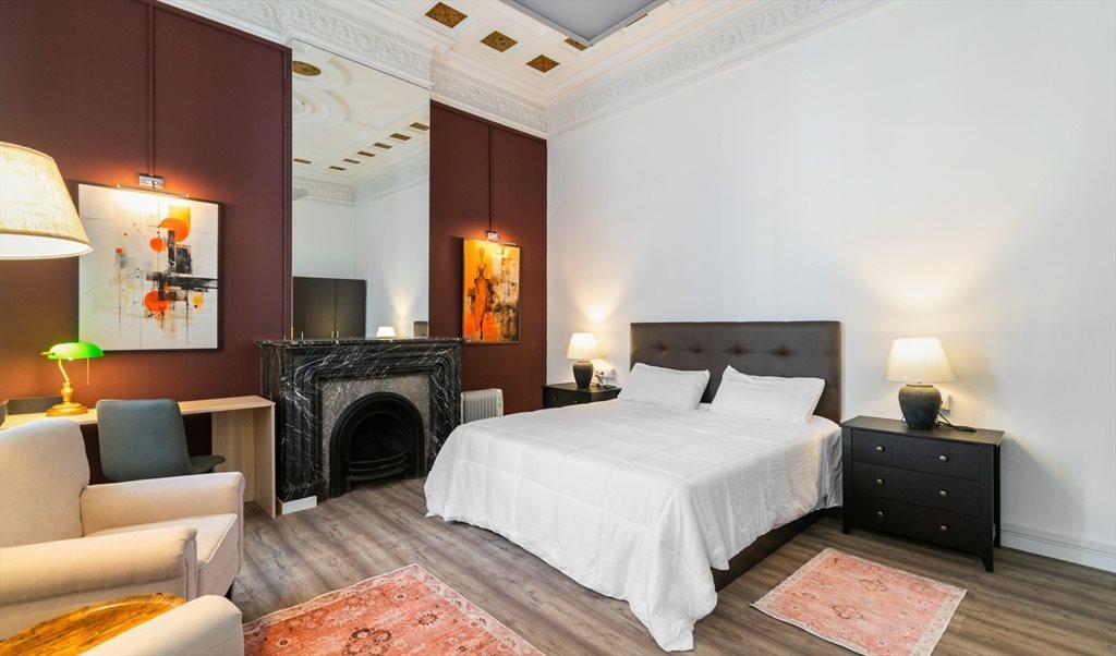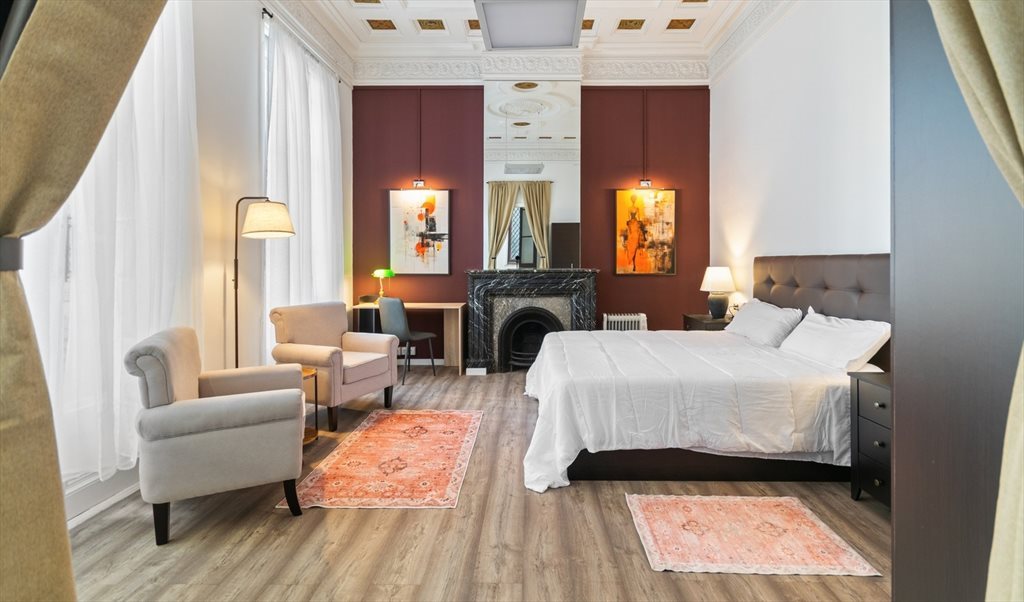 Dispone de cama doble, baño privado y una cuidada decoración que incluye techos altos con molduras originales, chimenea decorativa y grandes ventanales que aportan una excelente entrada de luz natural.