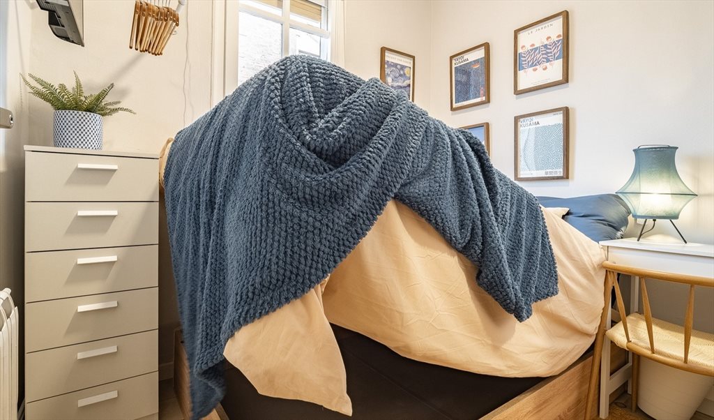 2. Complete room: bed with folding sofa, Smart TV, closet, desk. Includes pillows, cushions, comforter, sheets, hangers, wastebasket, and towels (all brand new). The room has a separate lock with external key and latch on the inside.