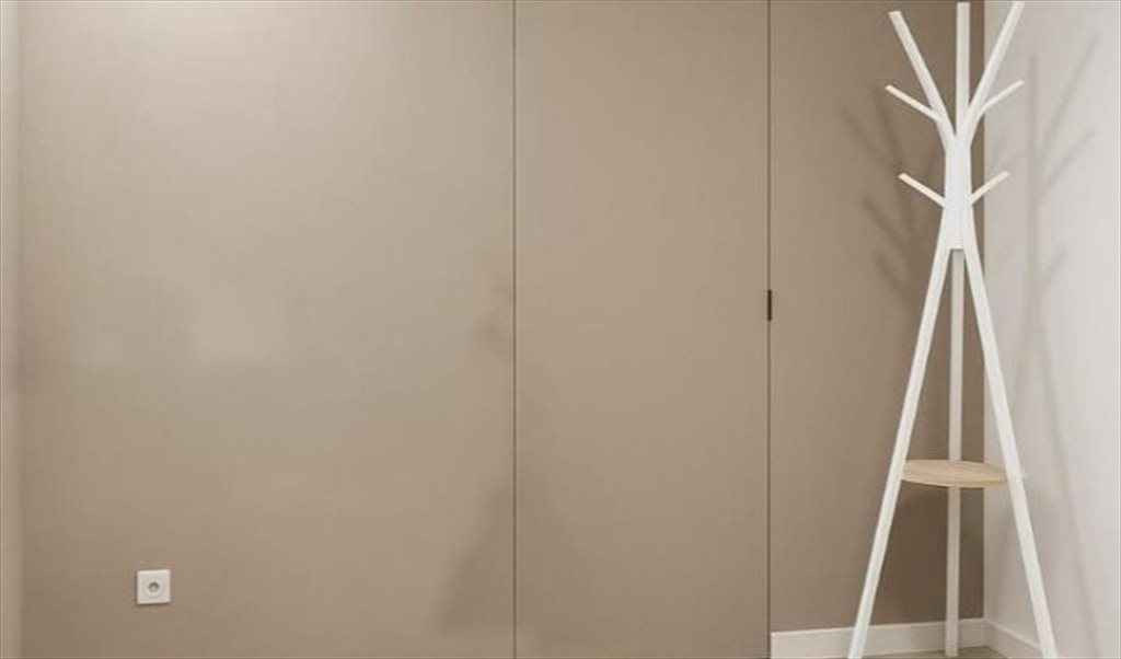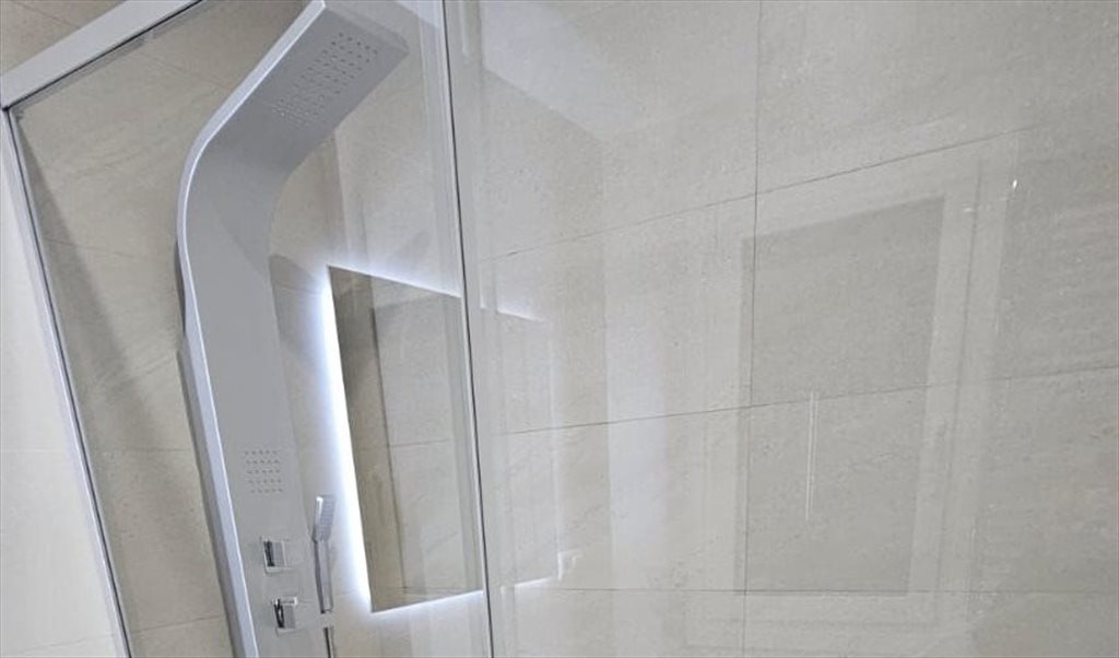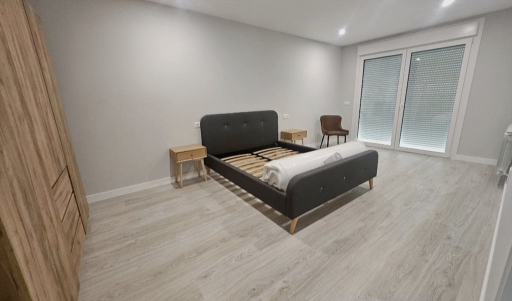 Habitación principal (330 €): cama grande con cabecero acolchado a estrenar, baño privado moderno con ducha amplia, acceso directo a terraza mediante puerta balconera, muy luminosa, con armario grande y decoración neutra de diseño.