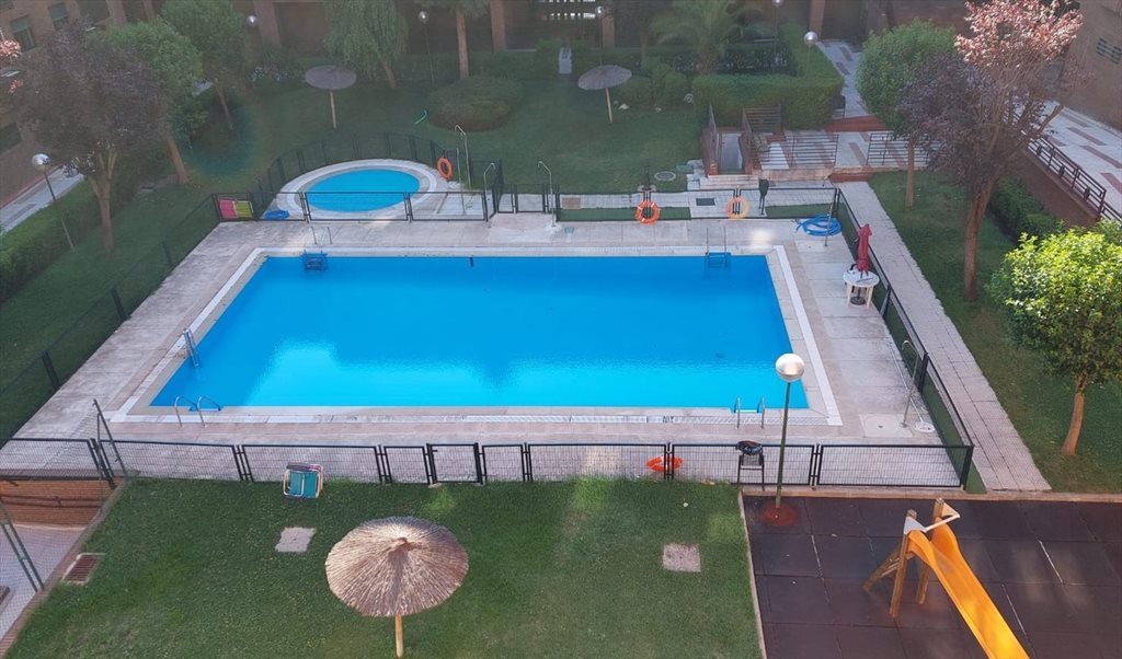 🏠 Habitación amueblada con vistas a la piscina y jardín.