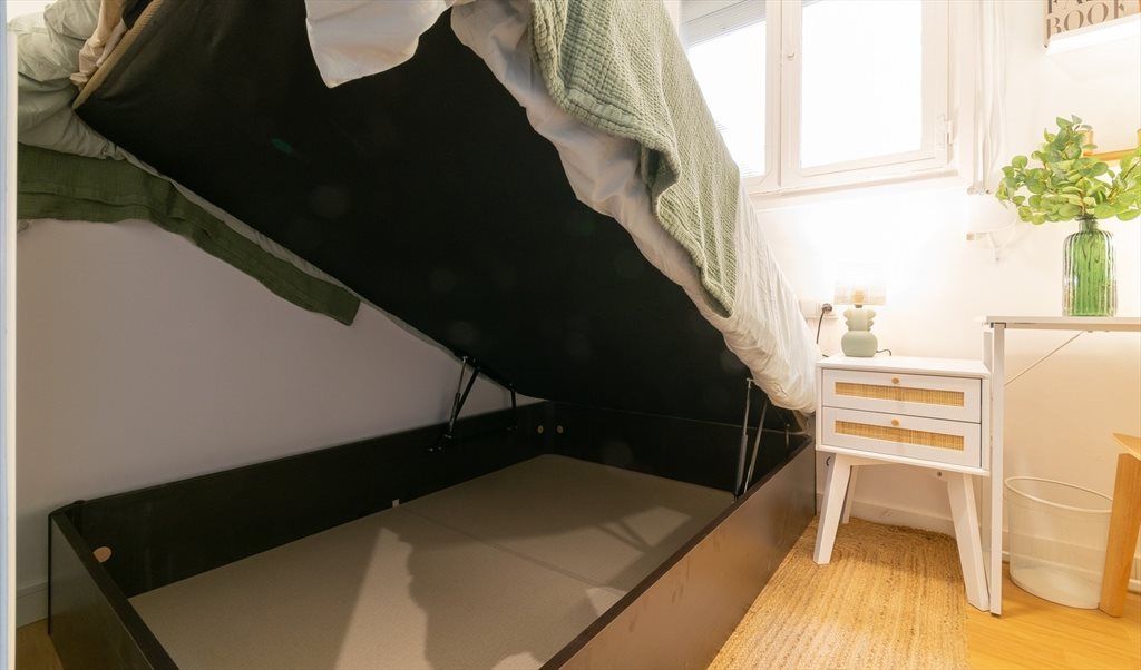 2. Complete room: bed with folding sofa, Smart TV, closet, desk. Includes pillows, cushions, comforter, sheets, hangers, wastebasket, and towels (all brand new). The room has a separate lock with external key and latch on the inside.