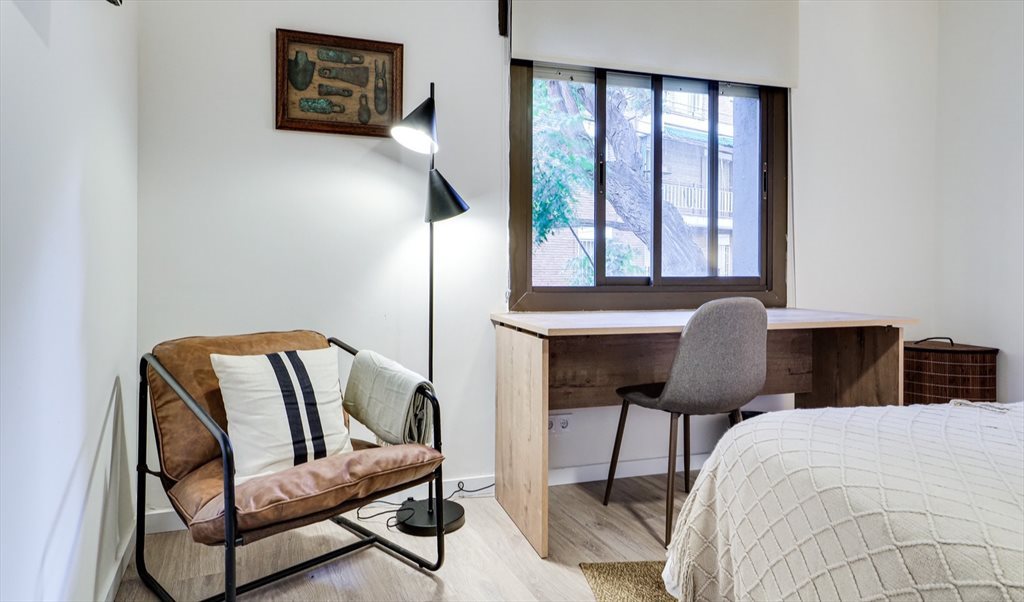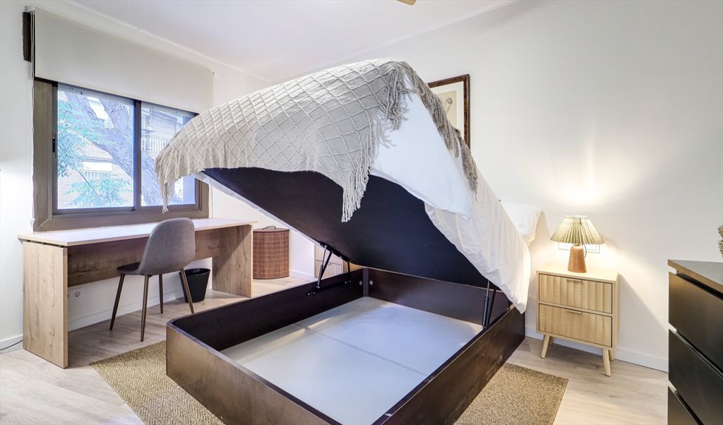 2. Complete double room: bed with underneath storage, Smart TV, desk. Includes pillows, cushions, comforter, sheets, hangers, clothes basket, wastebasket, and towels (all brand new). The room has a ceiling fan with different powers and a separate lock with external key and latch on the inside.