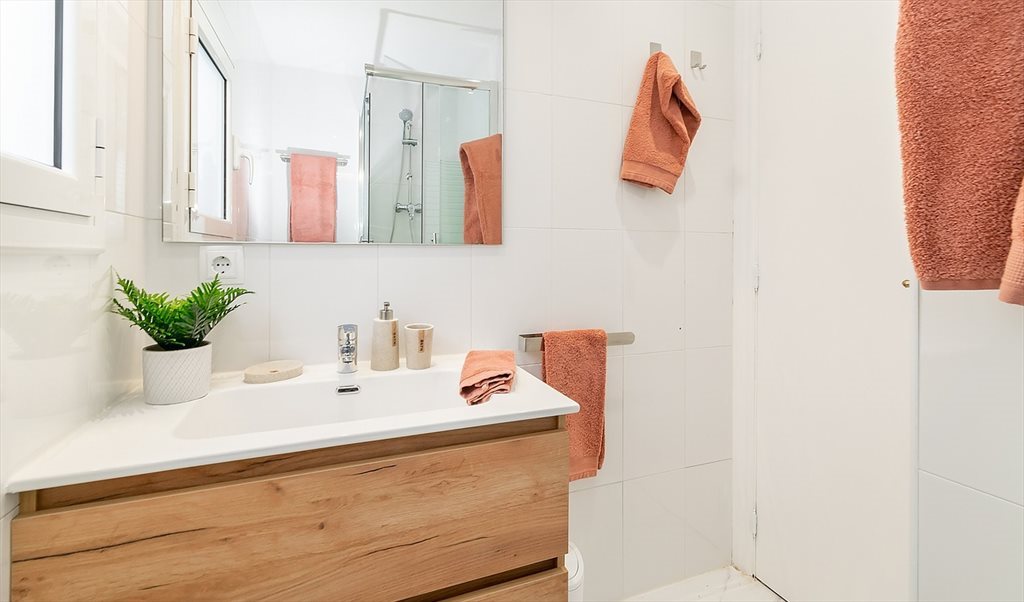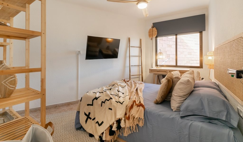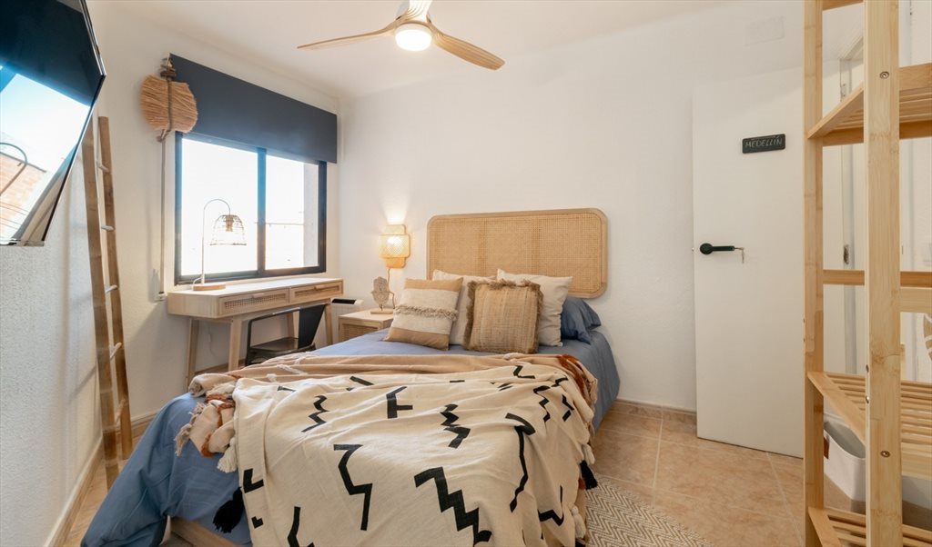 2. Complete double room: bed 150x190 with underneath storage, Smart TV, double closet, desk. Includes pillows, cushions, comforter, sheets, hangers, clothes basket, wastebasket, and towels (all brand new). The room has a ceiling fan with different powers and a separate lock with external key and latch on the inside.