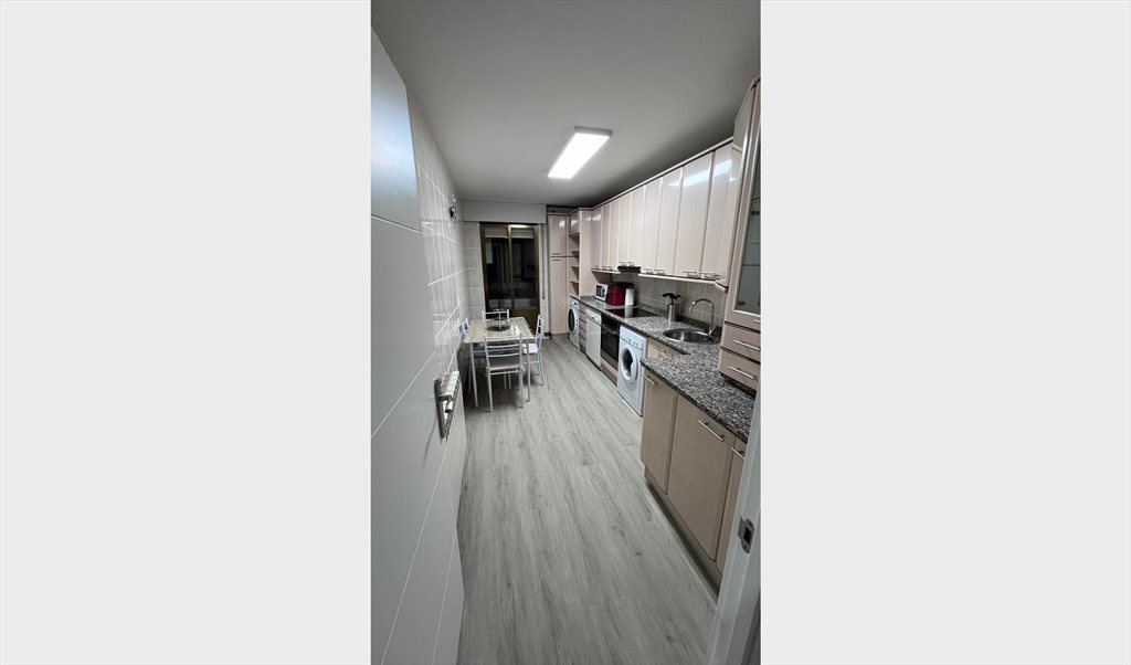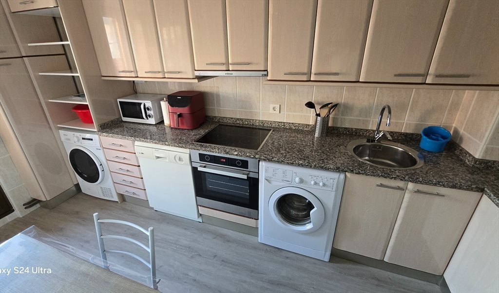 Cocina con secadora, lavadora, horno, lavavajillas, air fryer, y todo el menaje.