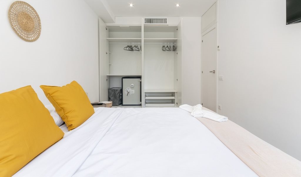 2. Complete double room: folding bed with storage space 150x190, Smart TV, fourth door build-in closet with security box, and desk. Includes pillows, cushions, comforter, sheets, hangers, wastebasket, and towels (all brand new). The room has air conditioning and heater.