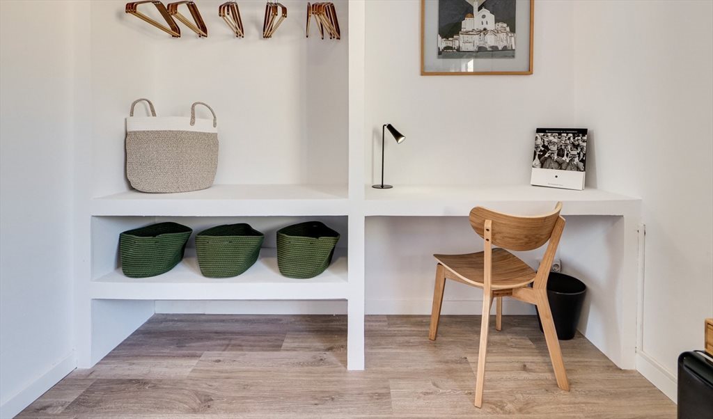 2. Complete room: bed with folding sofa, Smart TV, closet, desk. Includes pillows, cushions, comforter, sheets, hangers, wastebasket, and towels (all brand new). The room has a separate lock with external key and latch on the inside. Private exit without going through the common areas.