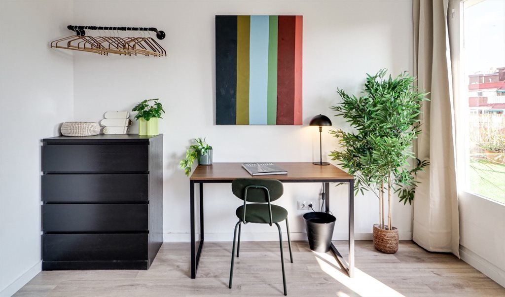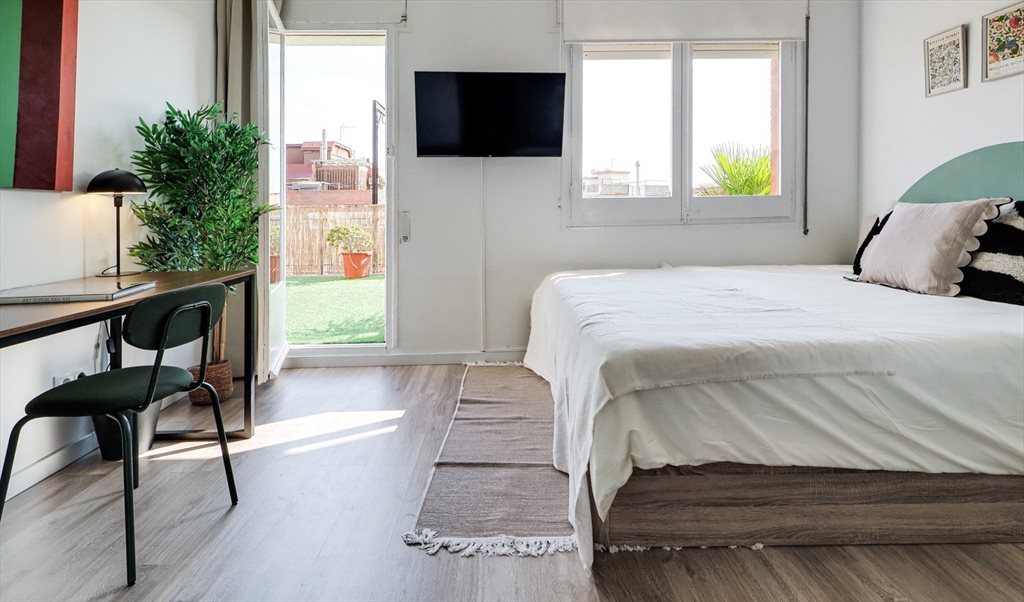 2. Complete room: bed with folding sofa, Smart TV, closet, desk. Includes pillows, cushions, comforter, sheets, hangers, wastebasket, and towels (all brand new). The room has a separate lock with external key and latch on the inside. Private terrace, shared between 2 rooms.