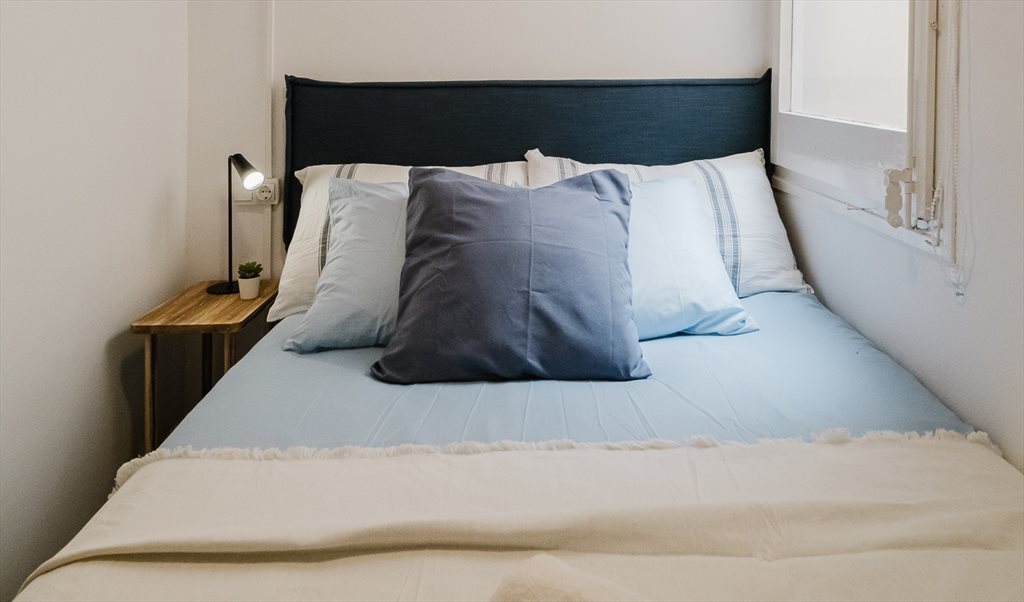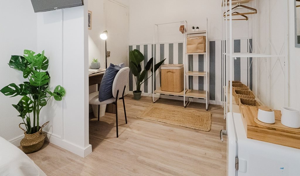 2. Complete room: bed with folding sofa, Smart TV, closet, desk. Includes pillows, cushions, comforter, sheets, hangers, wastebasket, and towels (all brand new). The room has a separate lock with external key and latch on the inside. Private exit without going through the common areas.