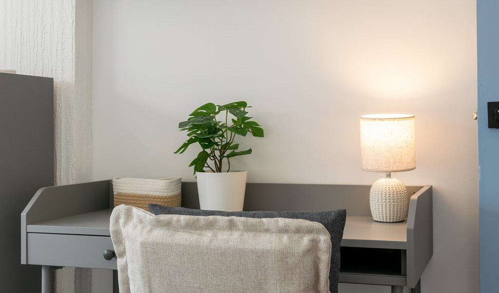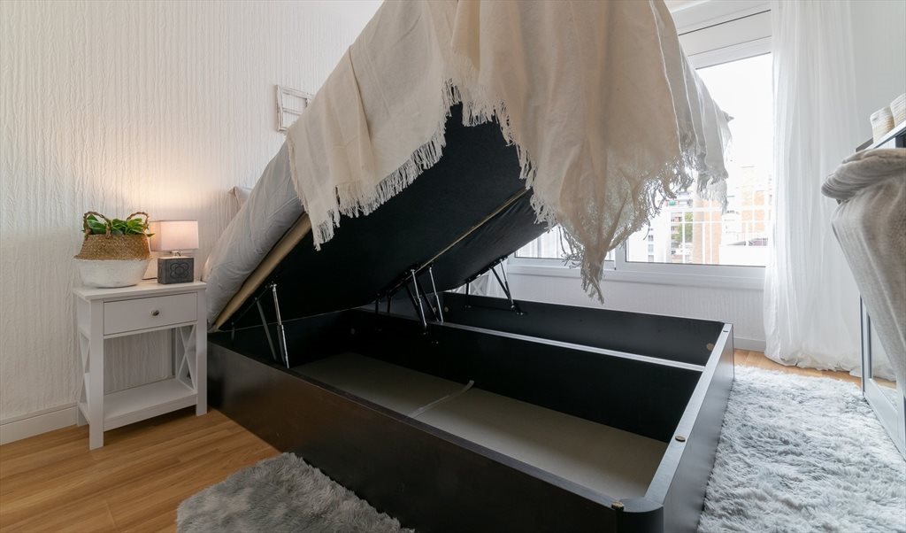 2. Complete room: bed with folding sofa, Smart TV, closet. Includes pillows, cushions, comforter, sheets, hangers, wastebasket, and towels (all brand new). The room has a separate lock with external key and latch on the inside.