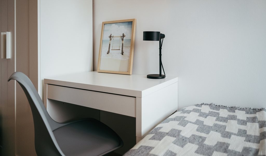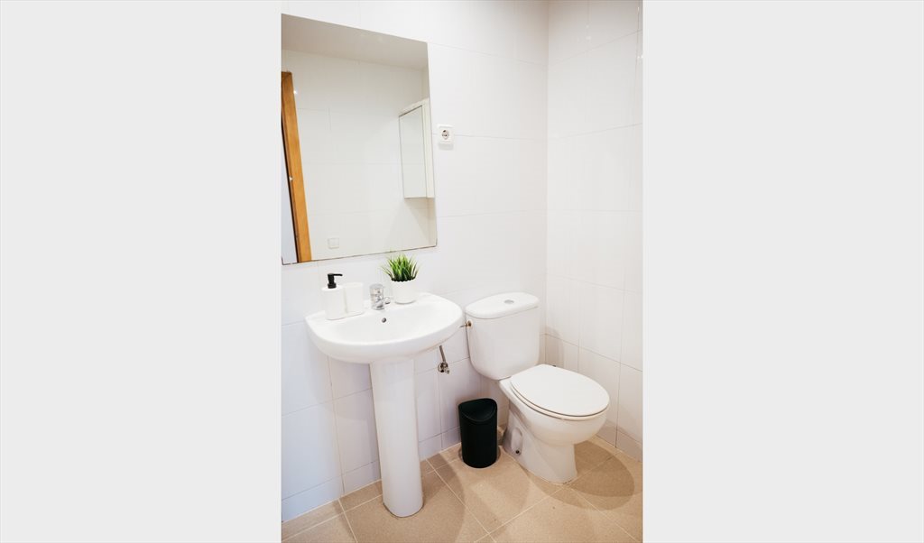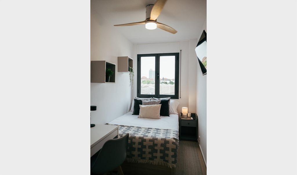 2. Complete double room: bed with folding sofa, Smart TV, desk, closet, vertical shelf. Includes pillows, cushions, comforter, sheets, hangers, laundry basket, and towels (all brand new). The room has a ceiling fan with different powers and an independent lock with key on the outside and latch on the inside.