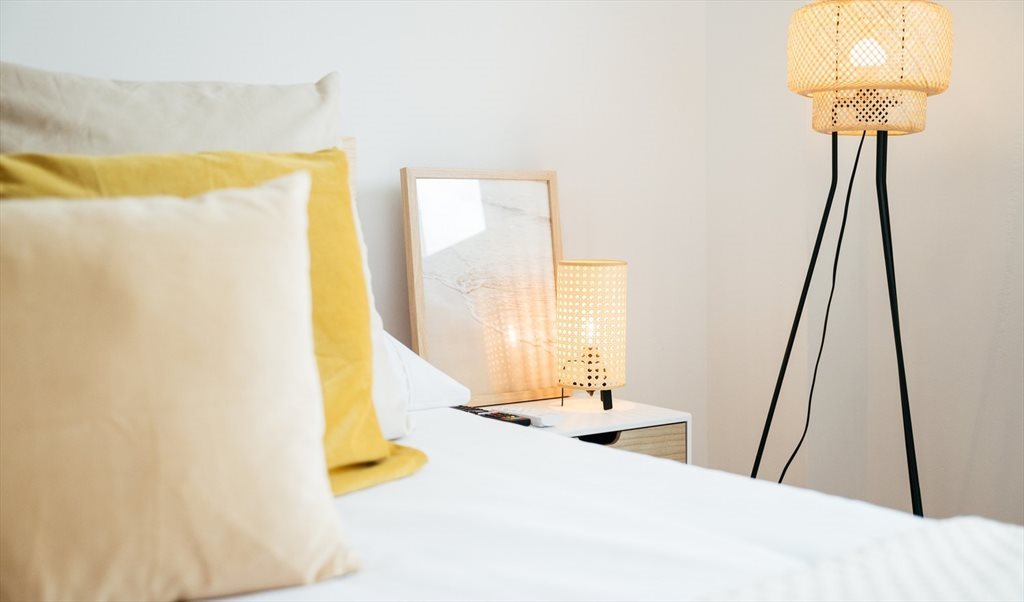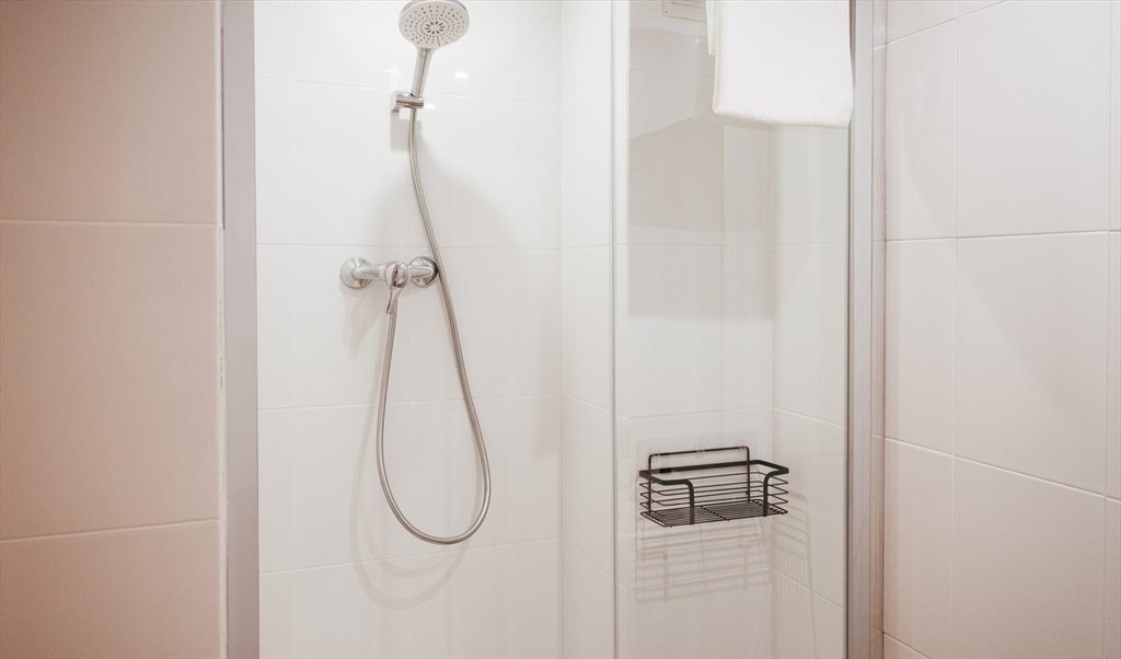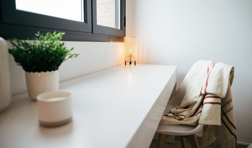 2. Complete double room: bed 150x190 with folding sofa, Smart TV, triple door closet, and desk. Includes pillows, cushions, comforter, sheets, hangers, laundry basket, and towels (all brand new). The room has a ceiling fan with different power settings and a separate lock with key on the outside and latch on the inside.