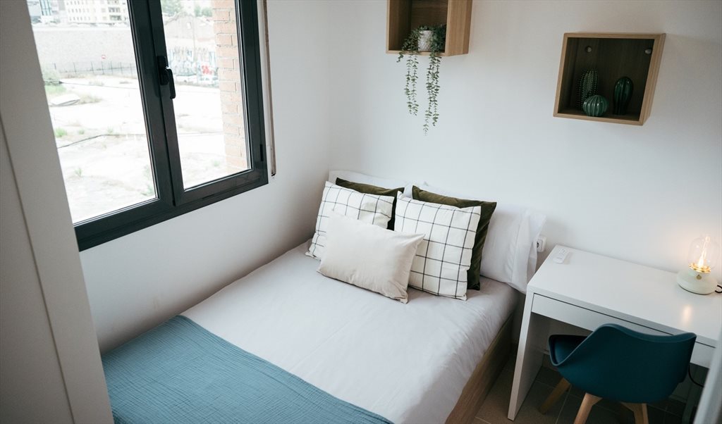 2. Complete room: bed 120x190 with folding sofa, double door closet, and desk. Includes pillows, cushions, comforter, sheets, hangers and laundry basket (all brand new). The room has a ceiling fan with different powers and an independent lock with key on the outside and latch on the inside.