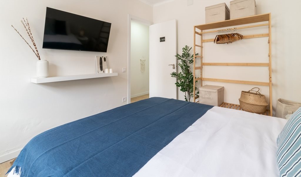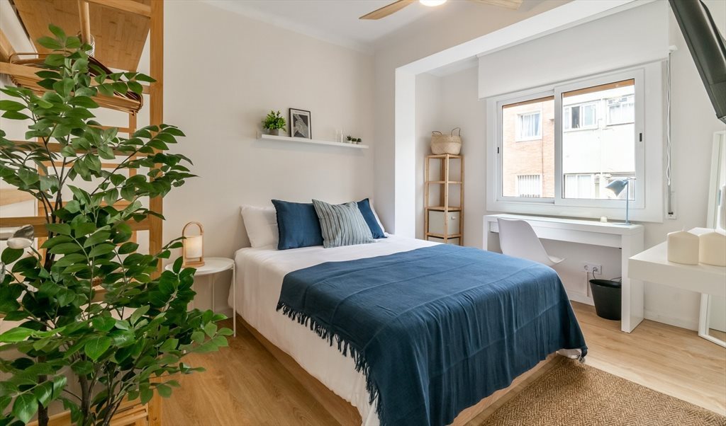 2. Complete double room: bed with underneath storage, Smart TV, double closet, desk. Includes pillows, cushions, comforter, sheets, hangers, clothes basket, wastebasket, and towels (all brand new). The room has a ceiling fan with different powers and a separate lock with external key and latch on the inside.
