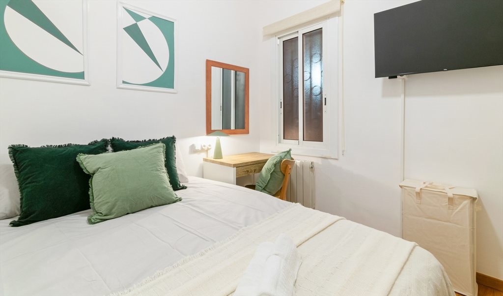PRIVATE BALCONY, SUPER BRIGHT, NEWLY RENOVATED AND WITH ALL NEW FURNITURE. Located in Barcelona INCLUDES: 1. All supplies water, electricity, gas, wifi and weekly cleaning 2. Complete room: Private bacony with chair, 150cm bed with folding sofa, Smart TV, closet, desk, mini fridge and coffee machine. Includes pillows, cushions, comforter, sheets, hangers, wastebasket, and towels all brand new. The room