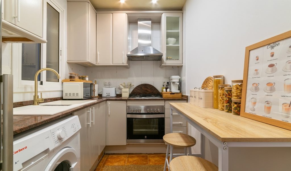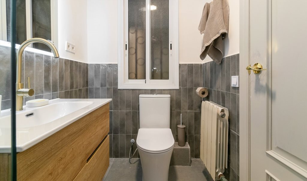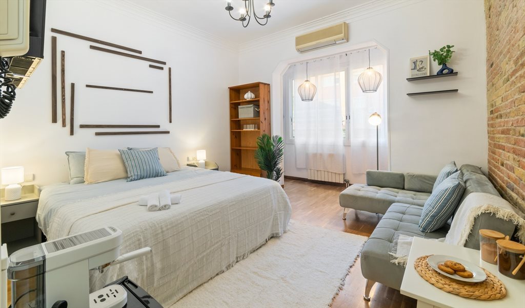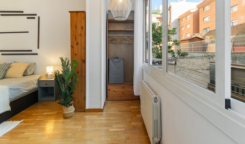 PRIVATE BALCONY, SUPER BRIGHT, NEWLY RENOVATED AND WITH ALL NEW FURNITURE. Located in Barcelona INCLUDES: 1. All supplies water, electricity, gas, wifi and weekly cleaning 2. Complete room: Private bacony with chair, 150cm bed with folding sofa, Smart TV, closet, desk, mini fridge and coffee machine. Includes pillows, cushions, comforter, sheets, hangers, wastebasket, and towels all brand new. The room