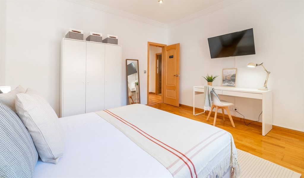 2. Complete double room: folding bed with storage space 150x190, Smart TV, triple door closet, and desk. Includes pillows, cushions, comforter, sheets, hangers, wastebasket, and towels (all brand new). The room has a ceiling fan with different powers and a separate lock with external key and latch on the inside.