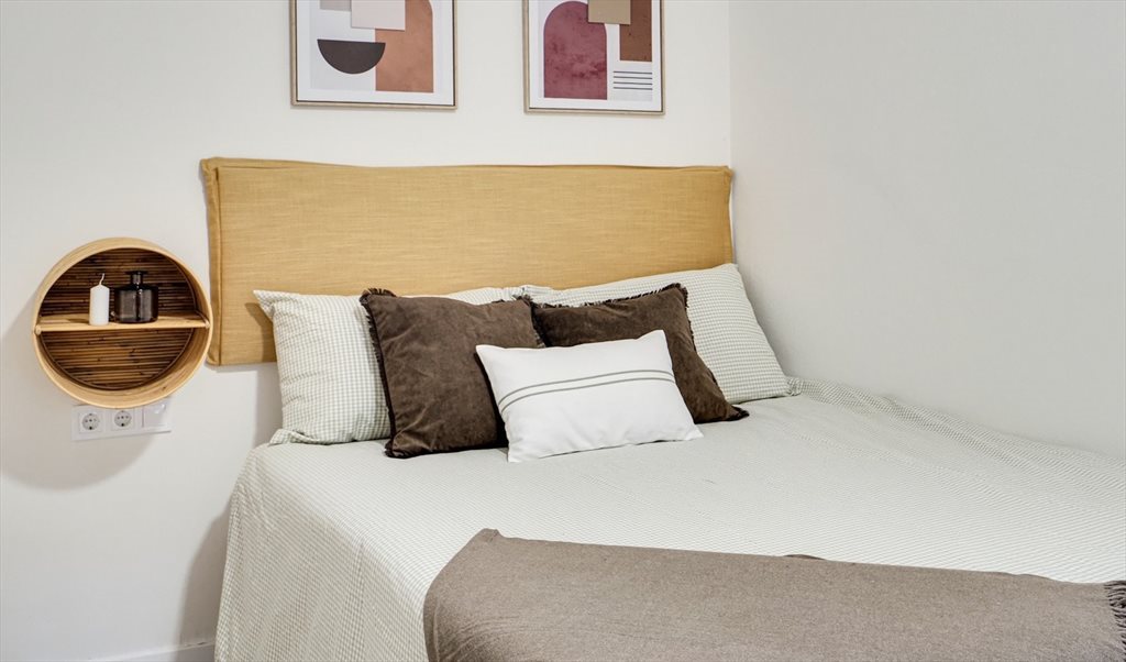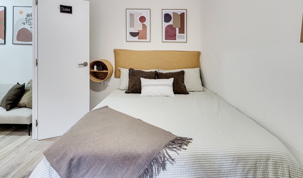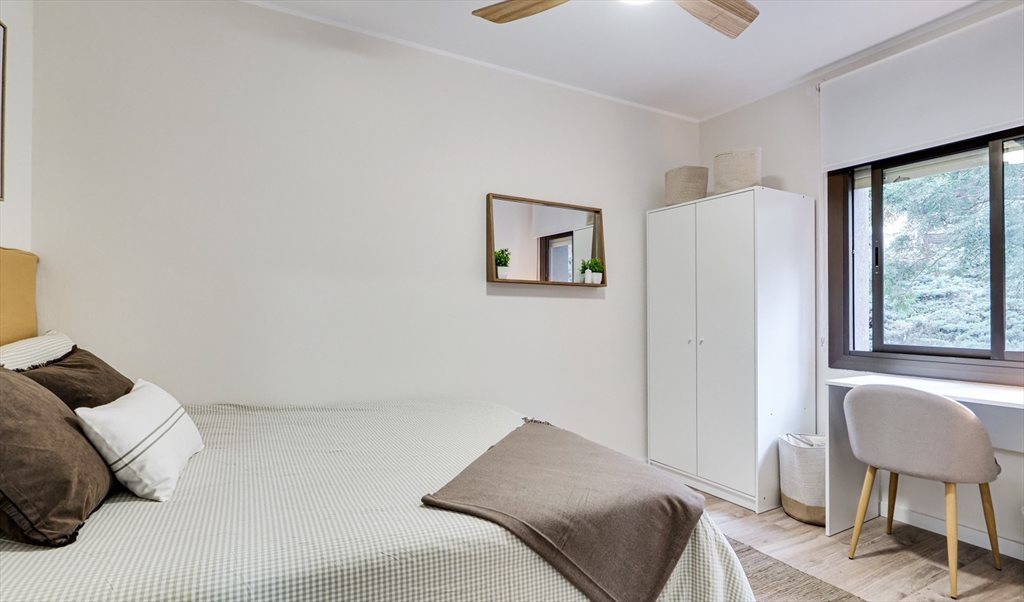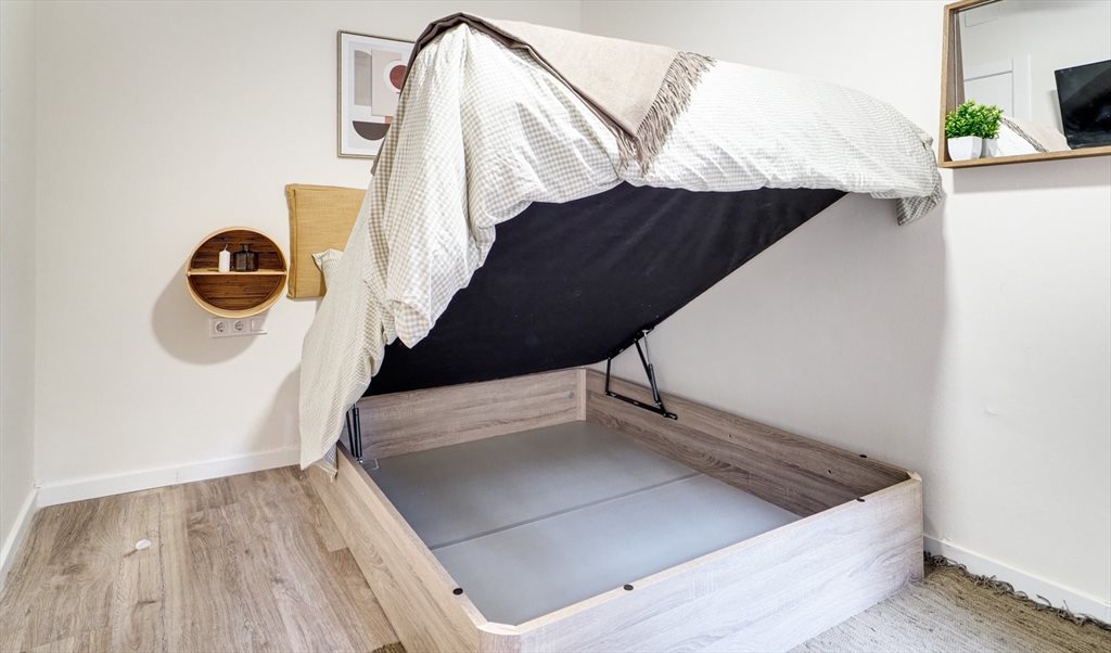 2. Complete double room: bed with underneath storage, Smart TV, desk. Includes pillows, cushions, comforter, sheets, hangers, clothes basket, wastebasket, and towels (all brand new). The room has a ceiling fan with different powers and a separate lock with external key and latch on the inside.