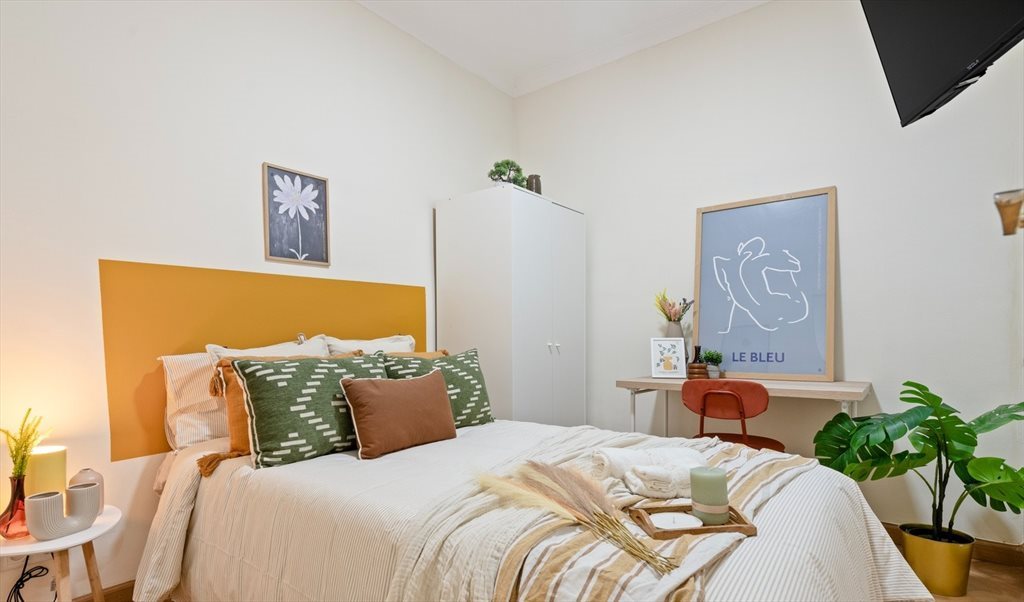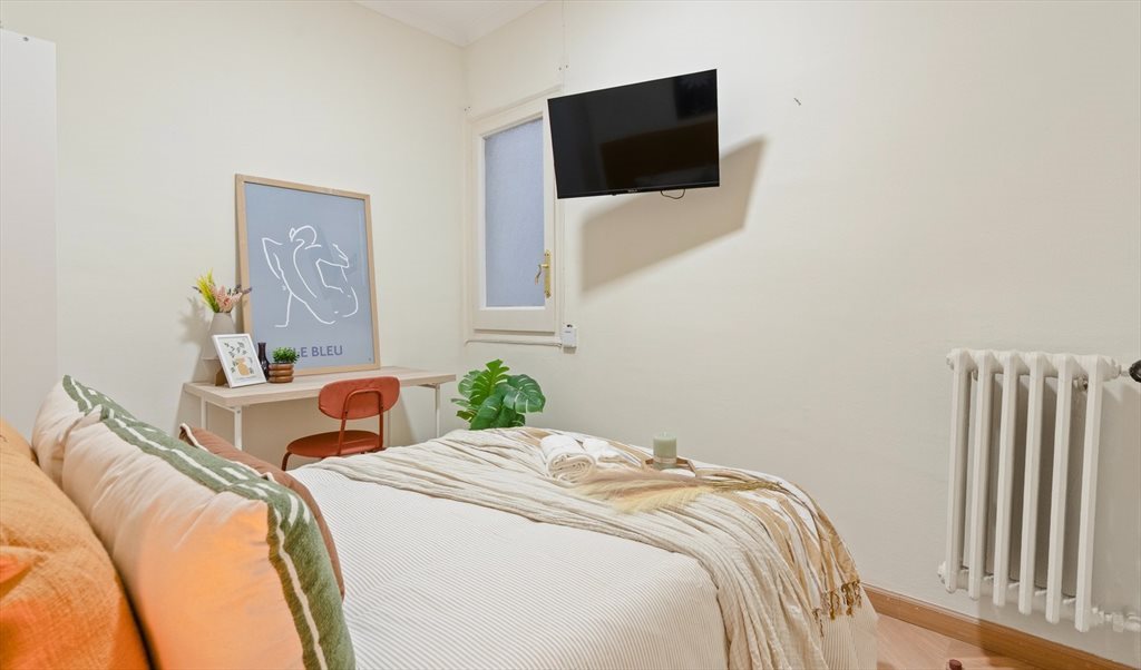 Modern and spacious double bedroom featuring a comfortable double bed, TV, desk and wardrobe. Fully furnished and designed for both comfort and functionality, the room offers a bright and pleasant atmosphere, ideal for relaxing, studying or working from home in a well-maintained shared apartment.