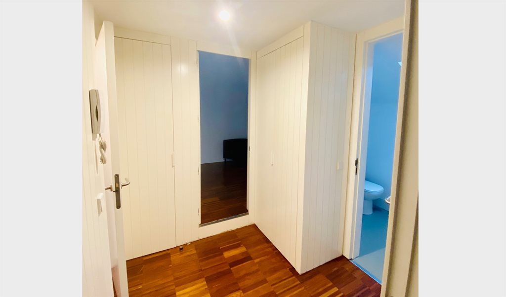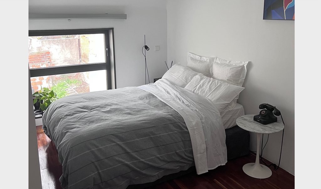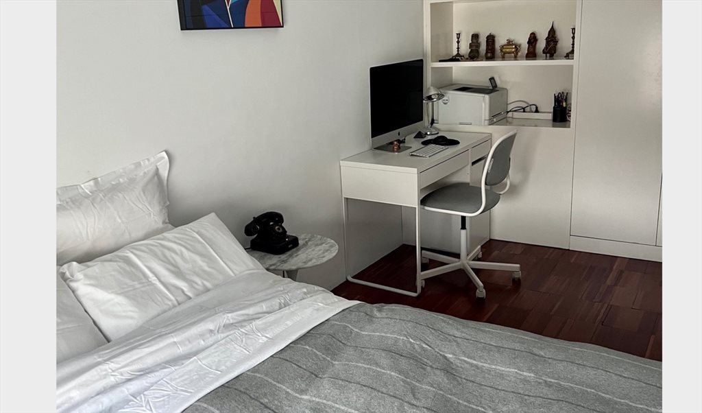 El dormitorio tiene cama doble, escritorio y armarios empotrados. Luminoso y con AA