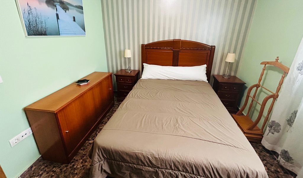 El dormitorio cuenta con una cama doble y armario empotrado, además de una gran cómoda y dos mesitas de noche con lamparillas.