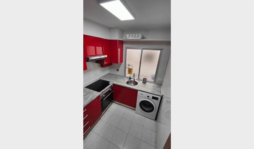 Cocina vitrocerámica con microondas, nevera congelador, horno y lavadora.